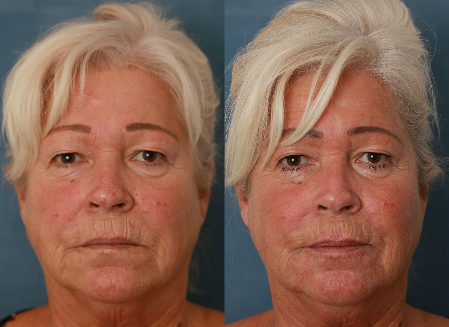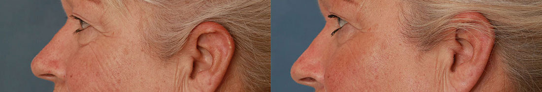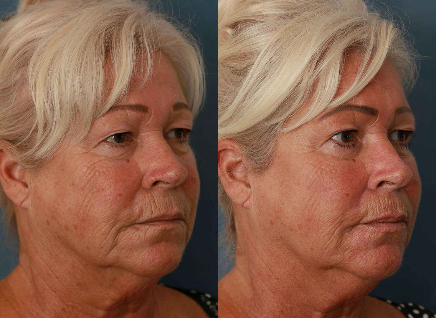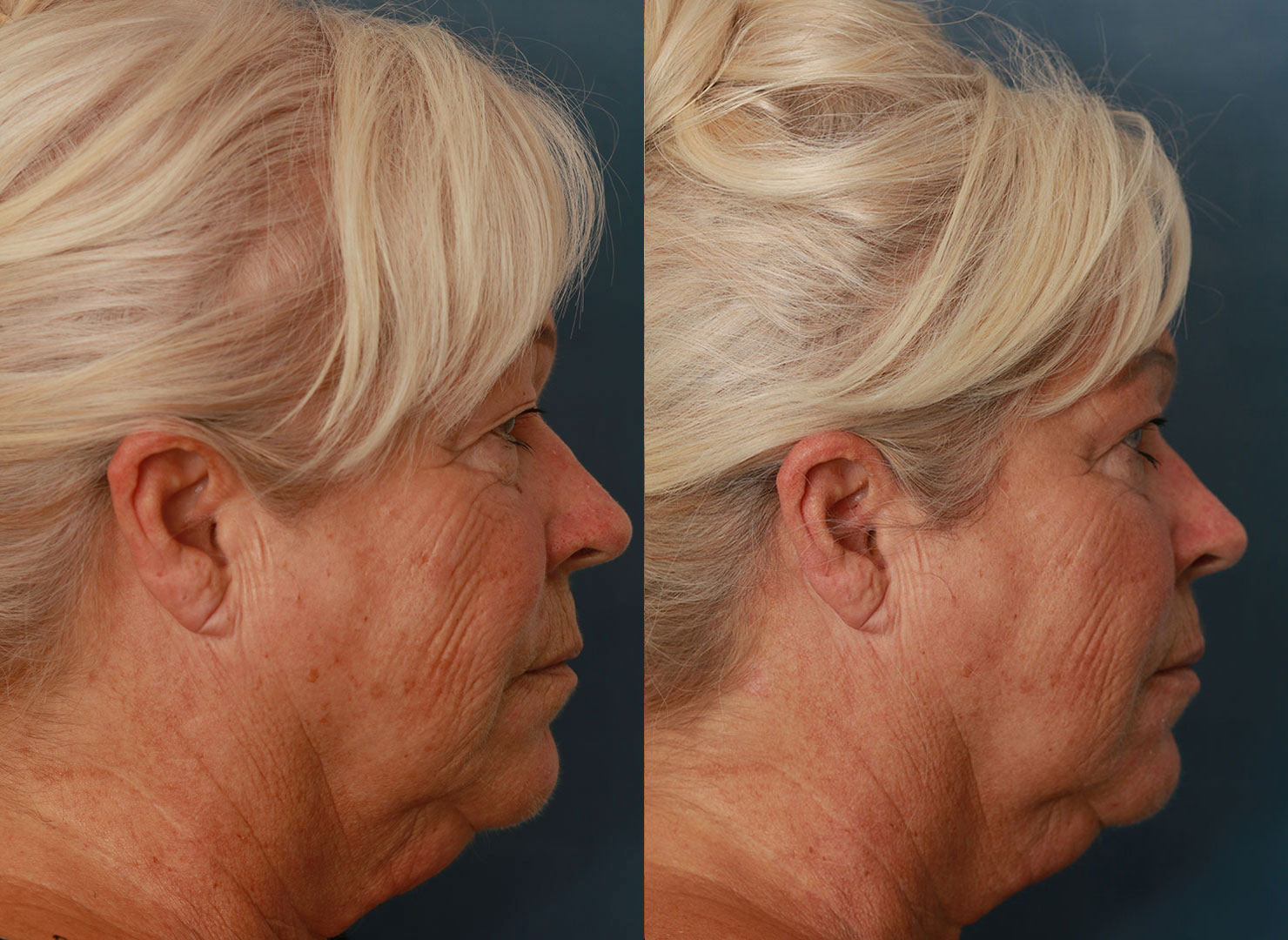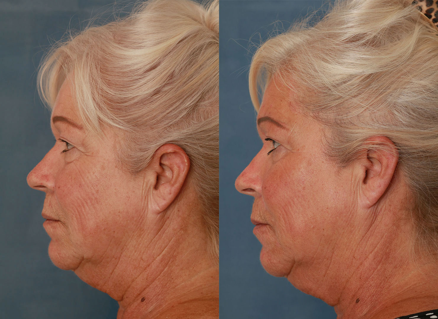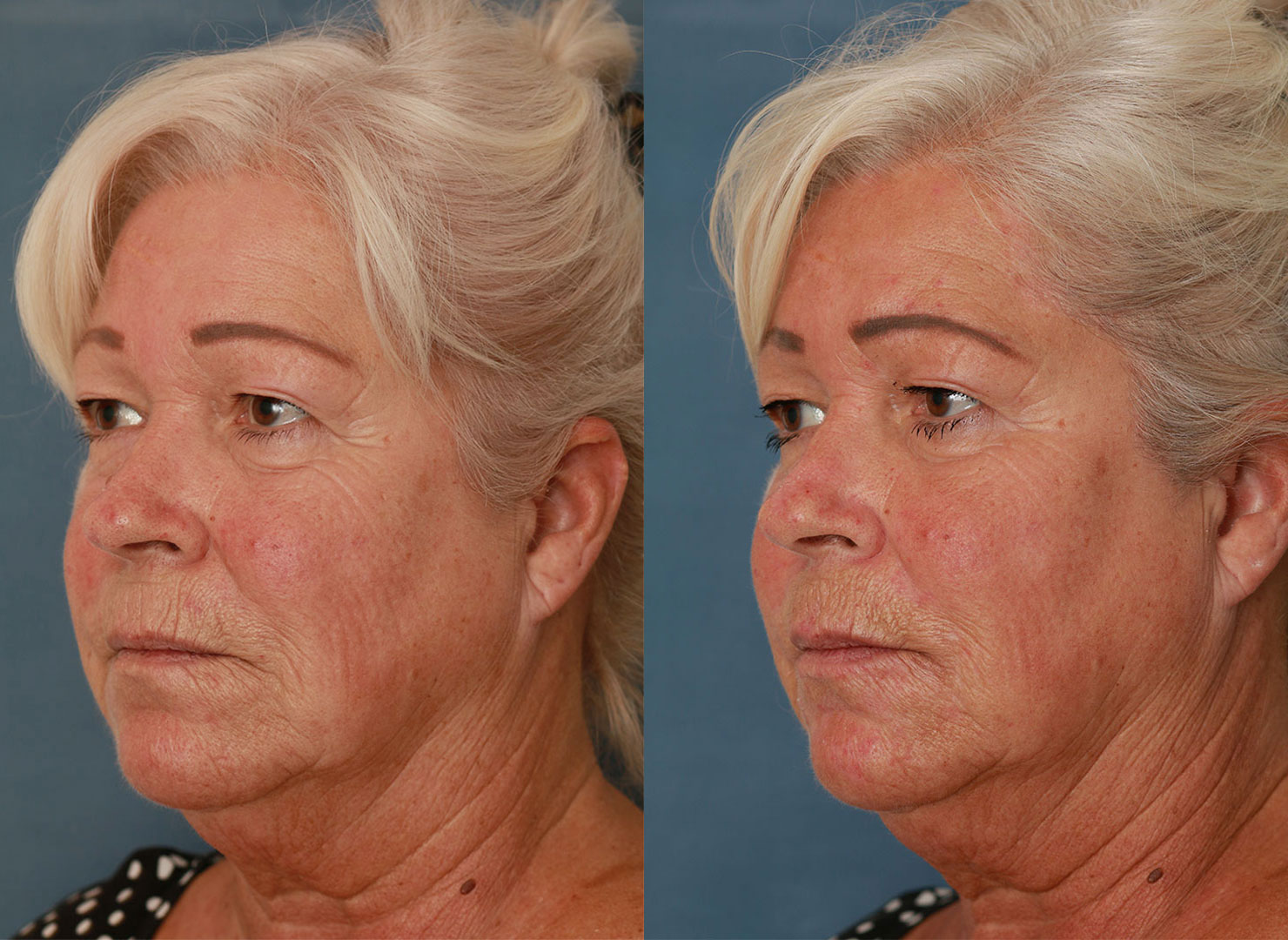 Hanny is een hele gezellige vrouw. De lijntjes rond de mond en de wat naar binnen toe gekeerde lippen doen echter afbreuk aan de gezellige uitstraling. Door de rokerslijntjes te behandelen, het lipvolume en de wangen wat meer volume (hogerop) te geven, ziet ze er weer veel guitiger uit! De rokerslijntjes zijn oppervlakkig behandeld met een dunne variant van Restylane. Door de tijd zal dit resultaat nog verder verbeteren. Zowel de boven- als onderlip zijn gevuld met Restylane Kysse, wat speciaal voor de lippen ontworpen is. Dit verzacht het gezicht. Tenslotten hebben we met 2 ml Restylane de ingevallen jukbeenderen weer in volume hersteld.