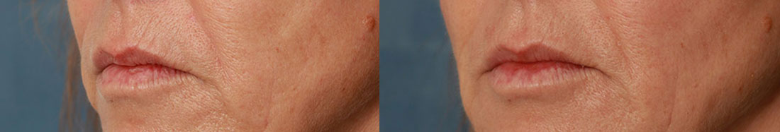 - De fijne lijntjes rond de mond, de lipcontour en de onderlip zijn gevuld met in totaal 1 ml Restylane.