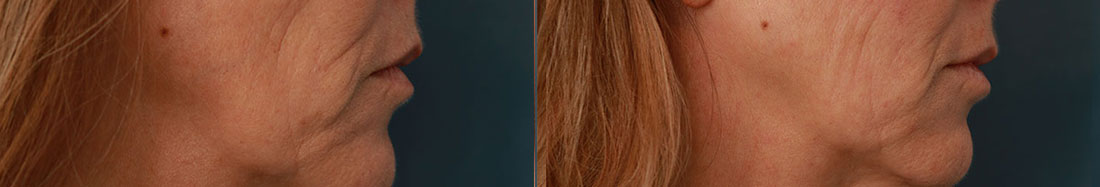 De marionetlijnen en het onderste gedeelte van de wangen zijn behandeld met 2 ml Restylane
